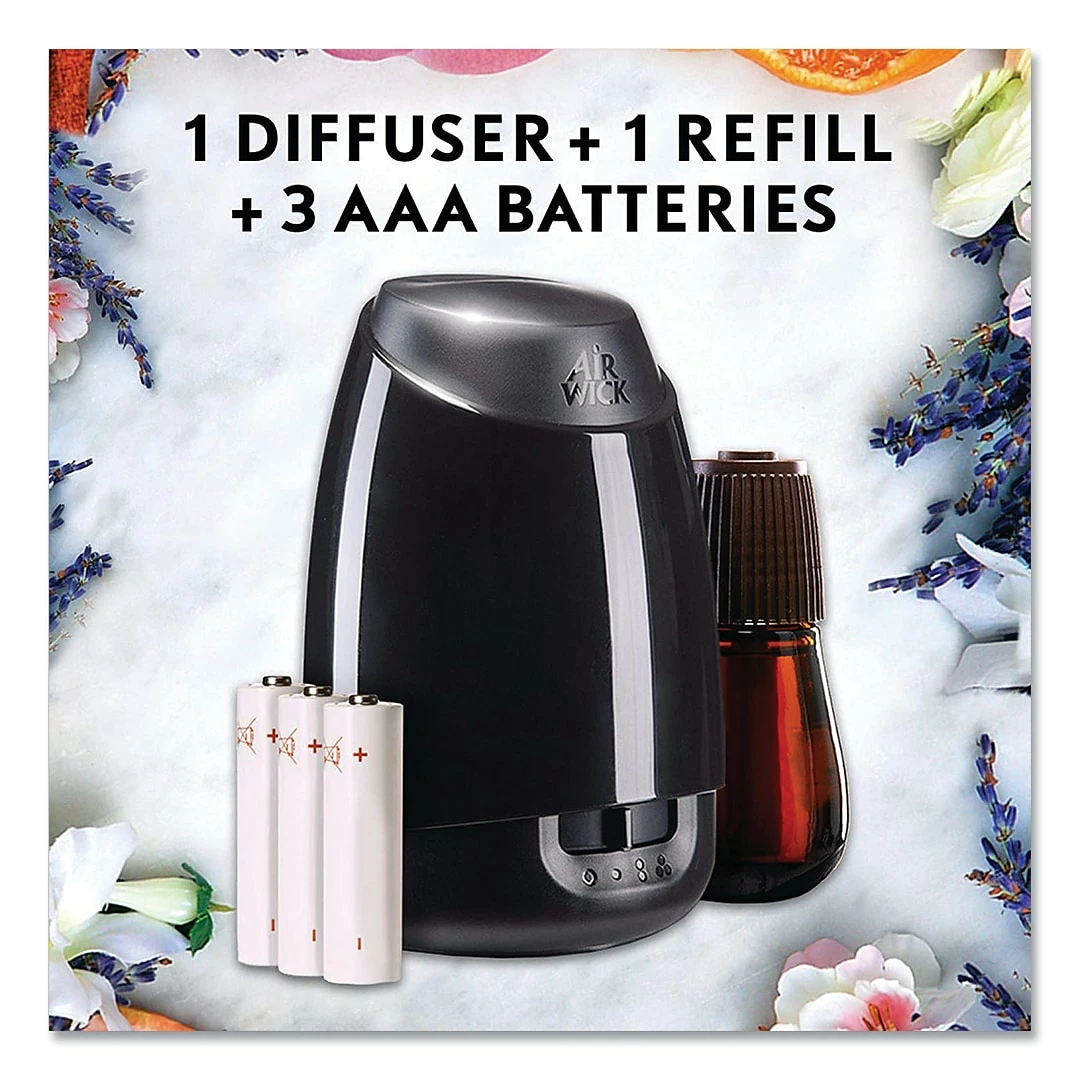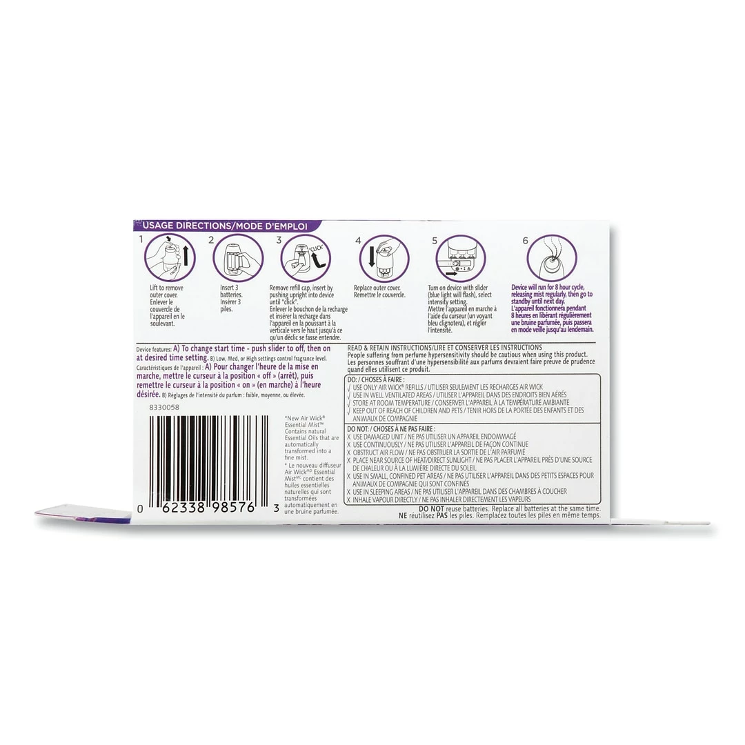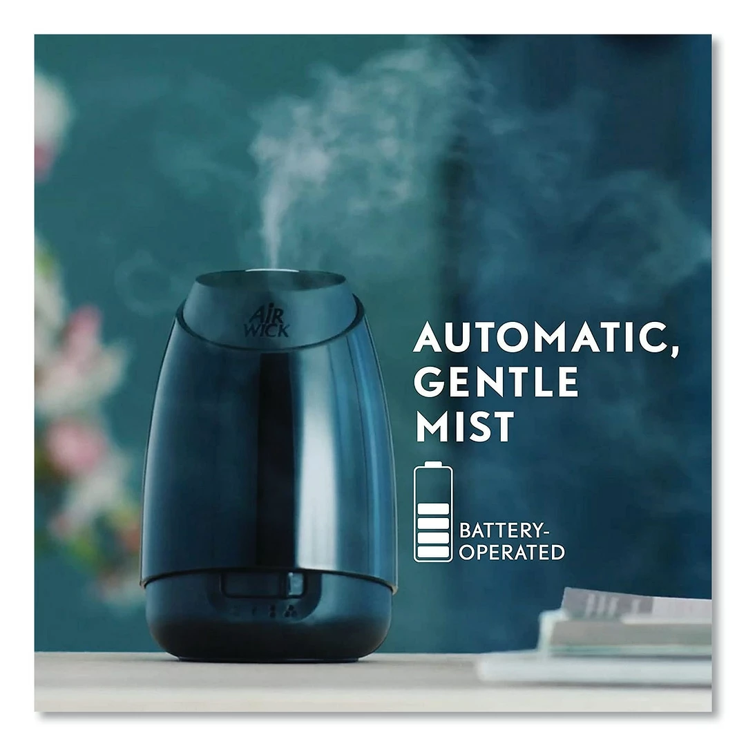 Once started, the device automatically shuts off after 8 hours, restarting at the same time the next day—8 hours on, 16 hours off. No water needed as it contains natural essential oils that diffuse into a mist through microscopic holes in the vibrating plate. Battery operated for placement anywhere. Each refill lasts up to 45 days on the lowest intensity setting. Batteries included.