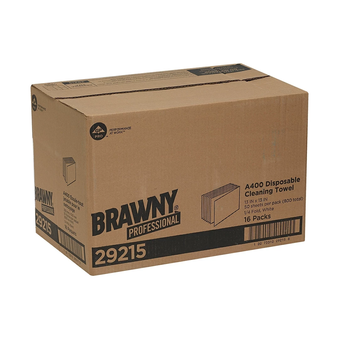 Give your cleaning crew a sturdy solution for cleaning up spills and messes with these GP PRO Brawny Professional white quarter-fold disposable cleaning towels.
