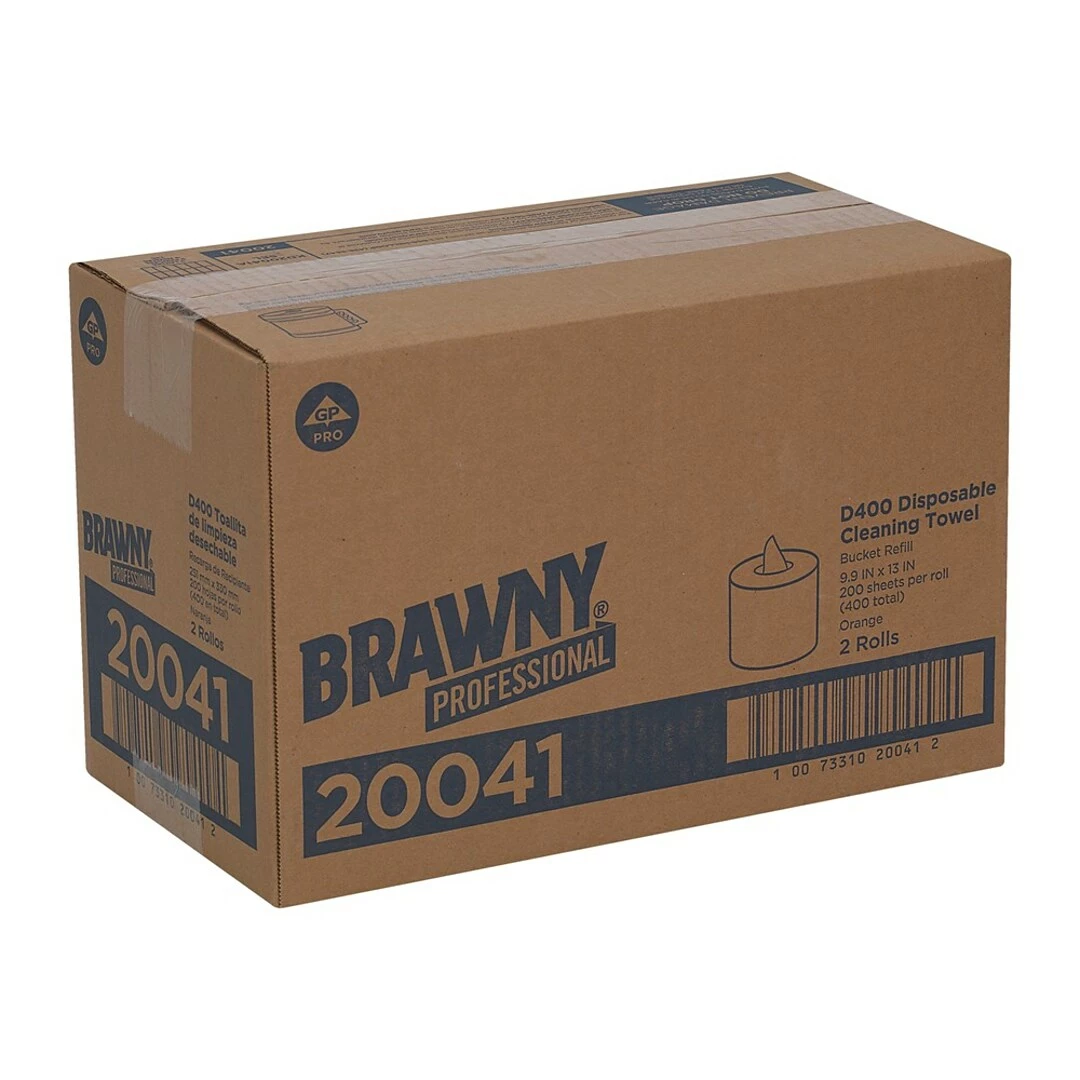 GP Brawny Professional disposable cleaning towels mop up all types of messes with a sturdy design that allows for fast moisture absorption. Ideal for absorbing water, grease and oil, these towels come in orange for a heavy-duty look. Each sheet features a large size for more cleaning range, reducing the need to use multiple sheets. Constructed of durable fibers, these towels offer bulk and strength to handle nearly any mess. With two rolls per case, you can refill more than one bucket.