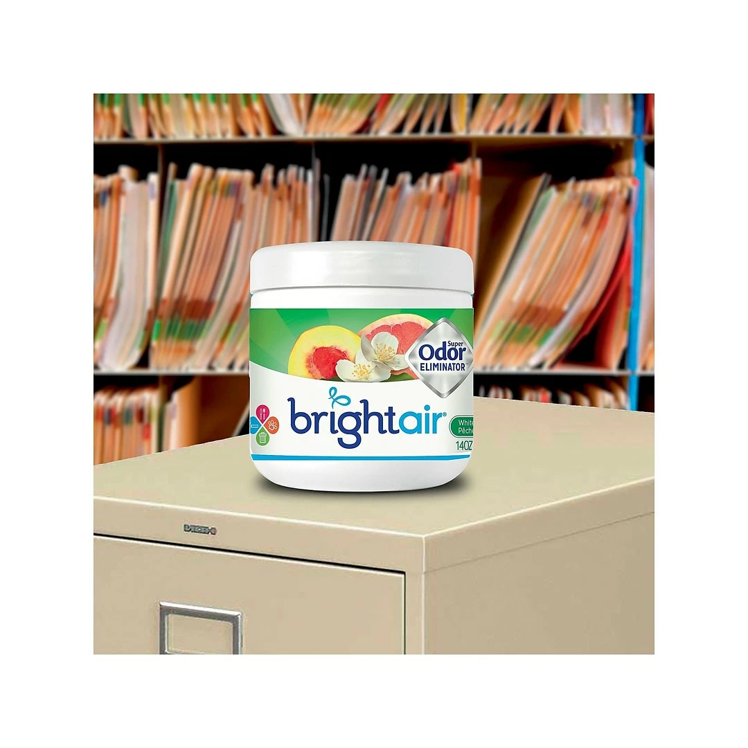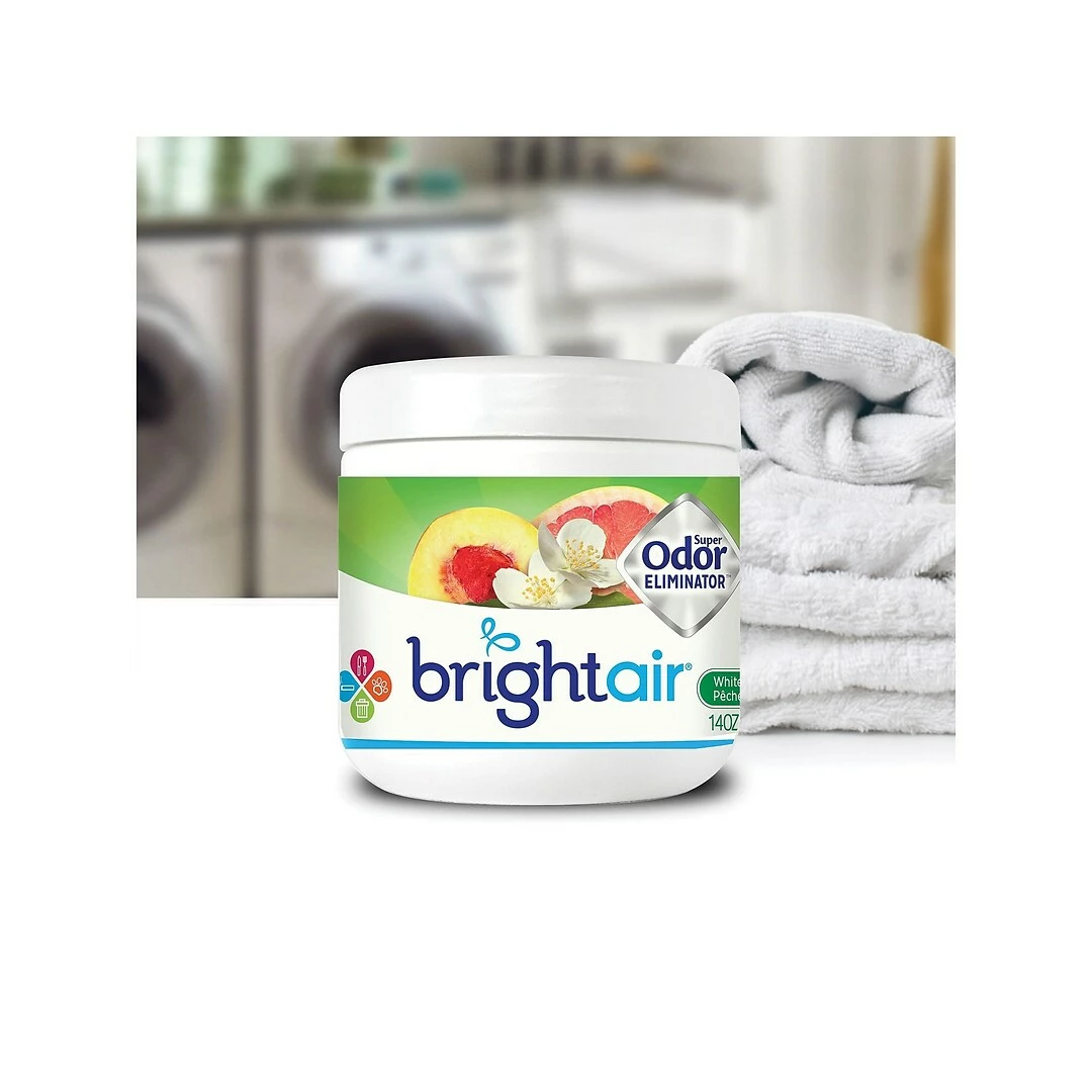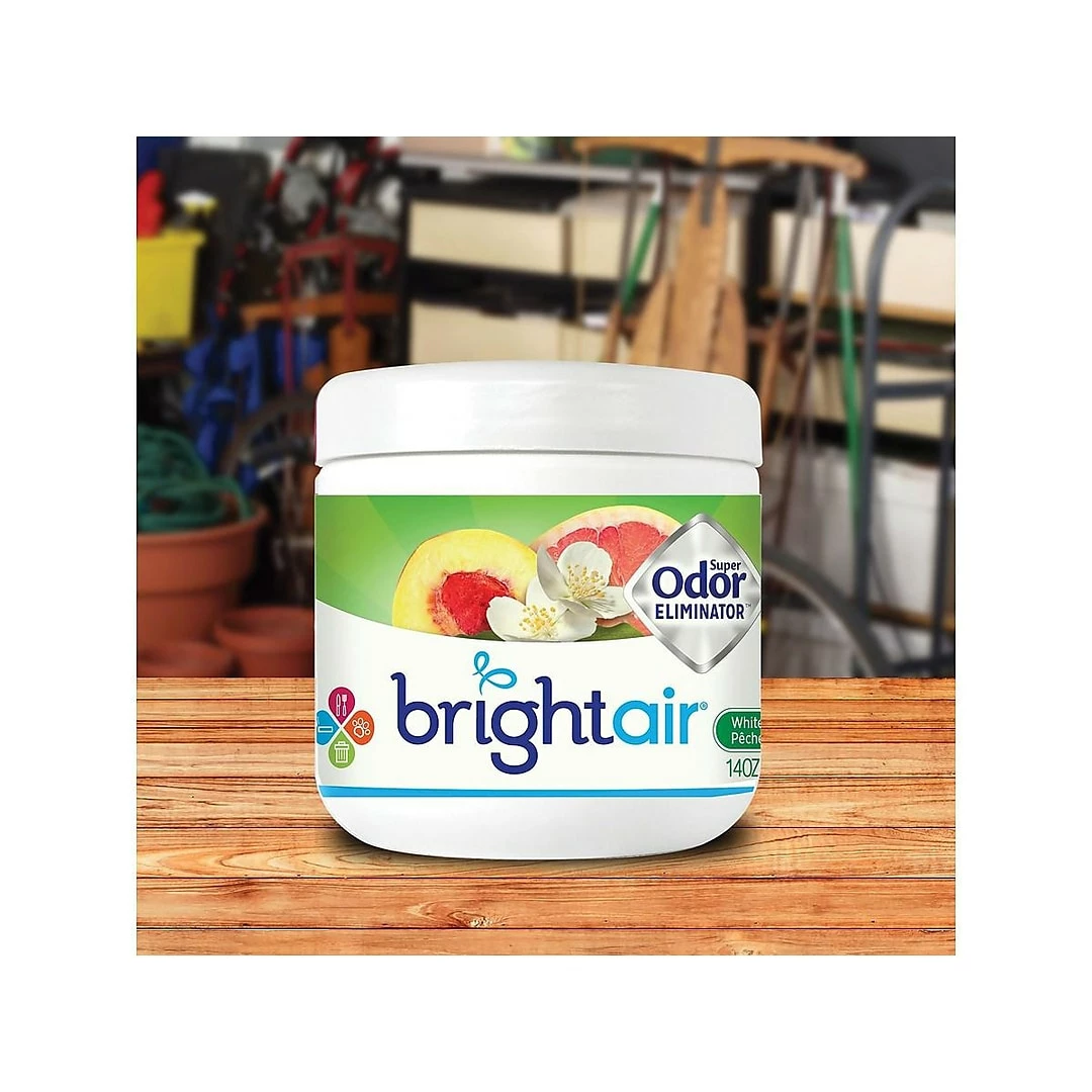 Remove the lid of this solid gel air freshener and place it near a fan to quickly spread freshness throughout your room. The white-peach-and-citrus scent is created with natural oils, which makes it safe to use in any area. This Bright Air Super Odor air freshener needs no electricity or batteries so you can use it anywhere.