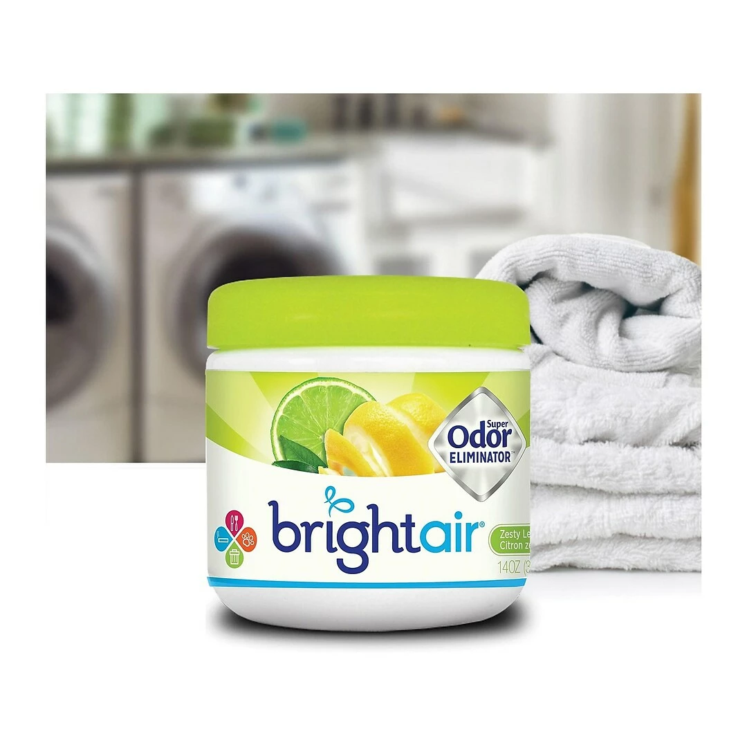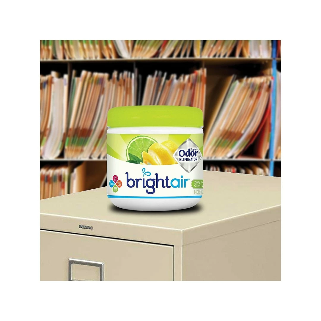 Help provide a cheerful ambiance thanks to this Bright Air solid air freshener that eliminates bad odors and leaves behind a pleasant scent of Zesty Lemon & Lime. Simply remove the lid and enjoy up to 60 days of continuous fragrance even in large areas.