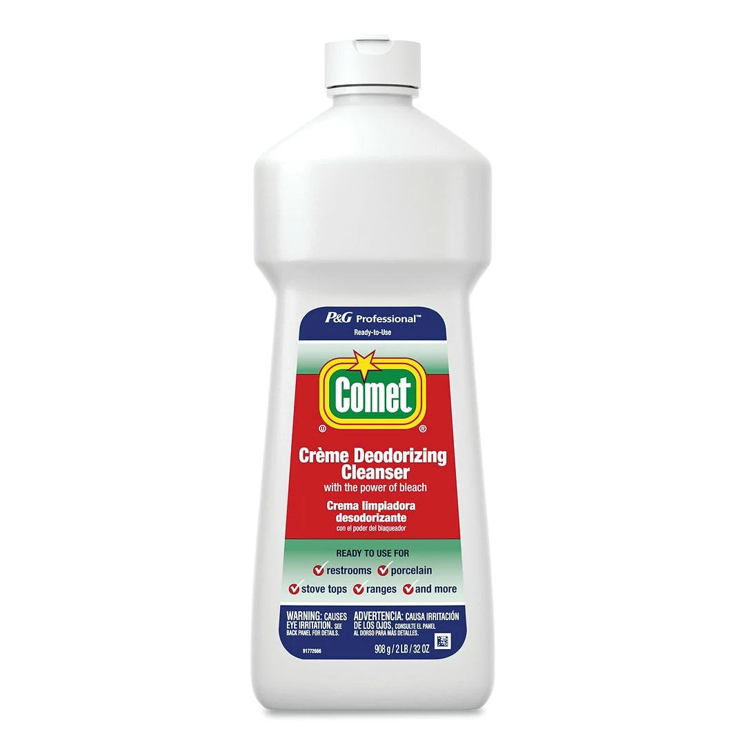 Deodorizing Cleanser with the power of bleach is a cream with a soft abrasive that scours and functions as a stainless steel cleaner and porcelain surface cleaner. It clings to vertical and hard-to-reach surfaces, like toilet bowls. Use in employee and customer restrooms to clean toilet bowls, urinals, sinks/vanities, wall tiles and chrome. This Comet multi-surface cleaner also works on stainless steel surfaces, stove tops and ranges, and the insides and outsides of plastic containers.