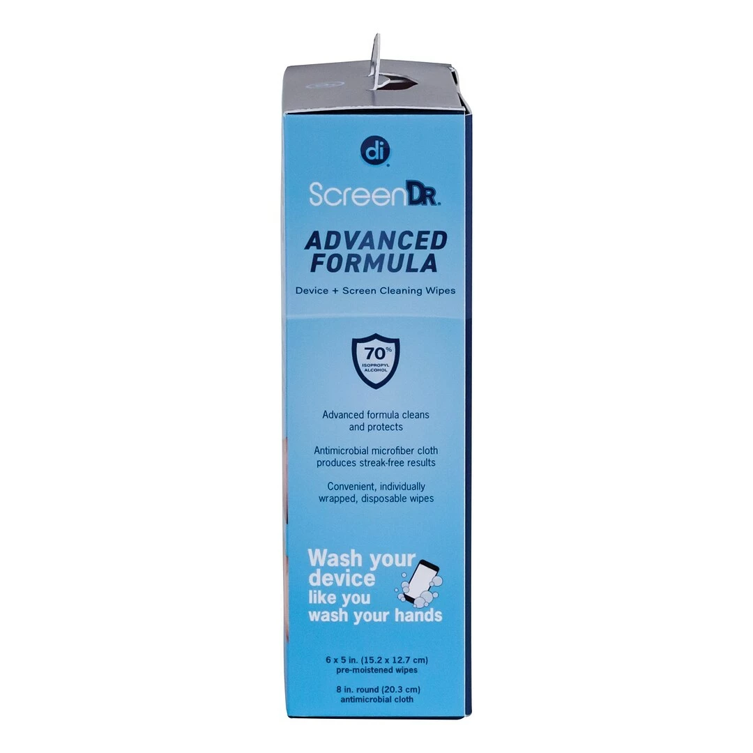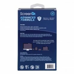 The 120-count Digital Innovations Screen Dr Advanced Formula wet wipes are 6″ x 5″ individually-wrapped, pre-moistened disposable wet wipes. These wipes contain 70% alcohol and are made in the USA. Also included is one 8″ round microfiber cloth that has been treated with antimicrobial agents for product protection and is machine washable.