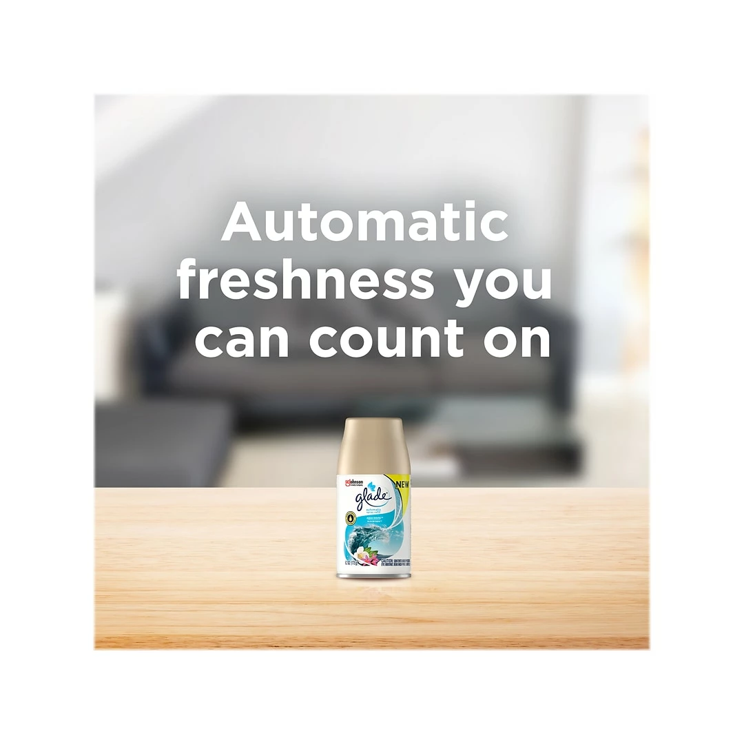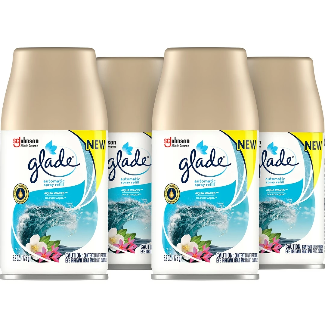 Customize your business’s air freshening experience with the Aqua Waves Glade automatic spray. Choose a setting on the holder’s timer to have the fragrance automatically dispensed into a room every 9, 18 or 36 minutes, or press the boost button for an instant burst anytime you want it.