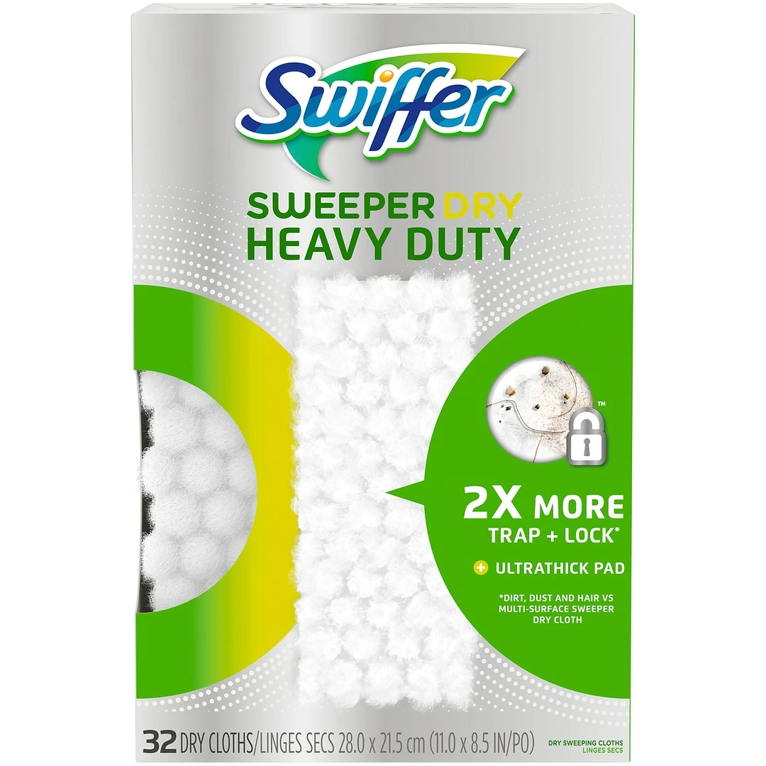 The Swiffer Sweeper Heavy Duty Dry Disposable Sweeping Cloths features over 30,000 3D fibers that brush into tight spaces collecting dust, dirt and pet hair. The cloth has a stronger electrostatic charge to provide excellent particle collection. The Swiffer Max disposable cloths are thicker and have deeper Lift & Lock Pockets. After you’ve grabbed the dry stuff with Swiffer sweeping cloths, remove stuck-on dirt with sweeper wet mop cloths. When you’re done, throw that pad and all its dirt away.
