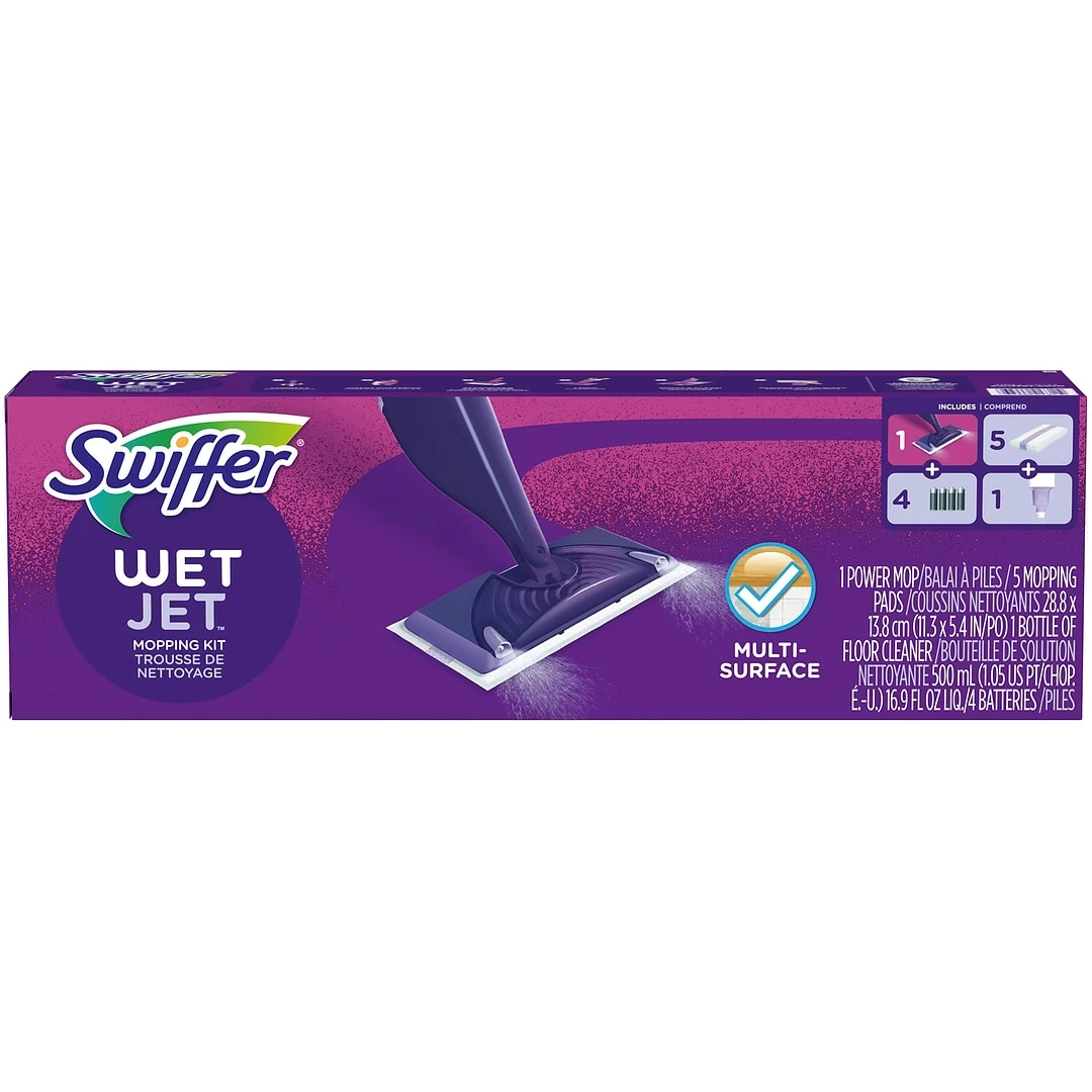 The Swiffer Wet Jet starter cleaning kit contains everything you need to get started dissolving hard-to-clean messes. The power mop and cleaning solution are capable of eliminating even the most difficult to clean dried-on messes much more quickly than an ordinary mop.
