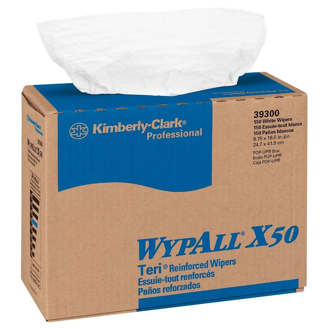 WypAll® X50 TERI* Reinforced Wipers, POP-UP*, Made of scrim reinforced material. Reinforced for extra scrubbing and cleaning power. Tough enough for big jobs but soft enough for face and hands. Made from recycled paper. White color.